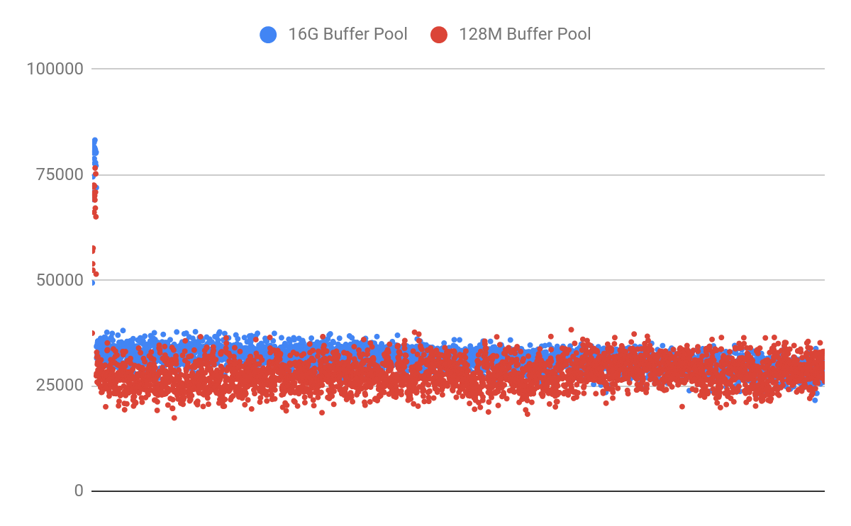 With Table A, the performance is stable and consistent because the inserts are to the end of the table and the required pages are in memory. I repeated the benchmark with a 128MB buffer pool and observed only a 13% decrease in performance: